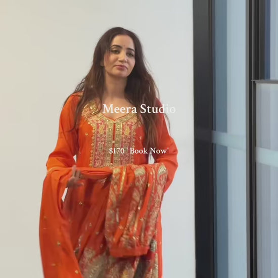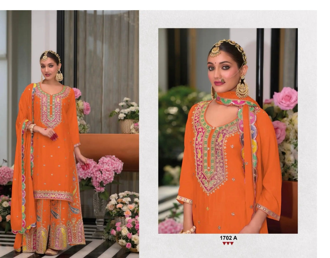 Elevate your festive wardrobe with this exquisite ready-to-wear ensemble crafted from premium pure Chinon fabric, offering a luxurious drape and subtle sheen. The outfit features intricate handwork and delicate stone embellishments, adding timeless elegance and sparkle to every detail.