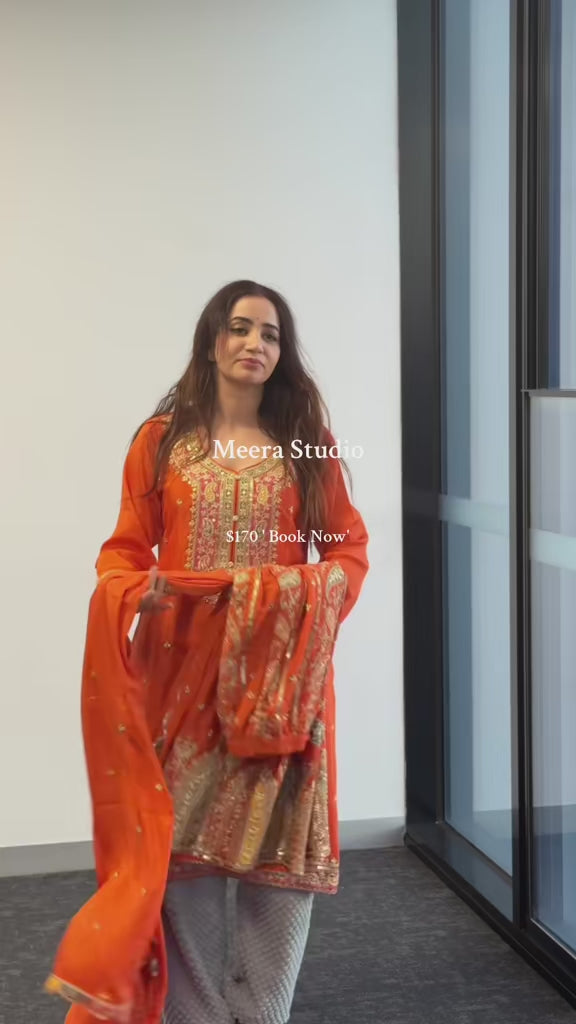 Paired with a heavily embroidered sharara, adorned with rich handcrafted detailing, this ensemble is perfect for weddings, formal events, or festive celebrations. Designed for effortless glamour, it blends traditional artistry with contemporary charm.