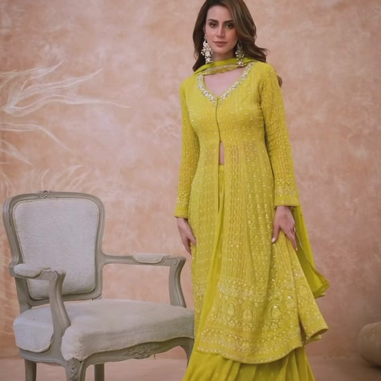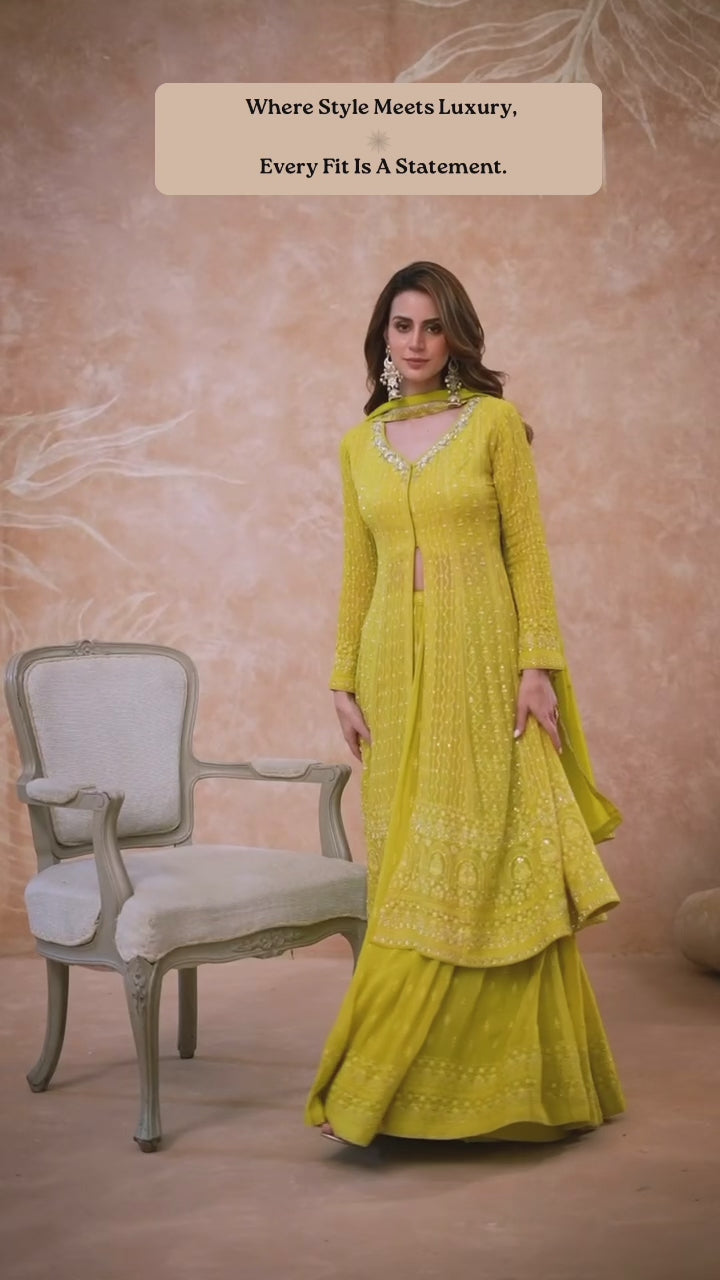 This Indo-Western suit set is crafted from luxurious real georgette fabric, offering an elegant blend of traditional and contemporary style.