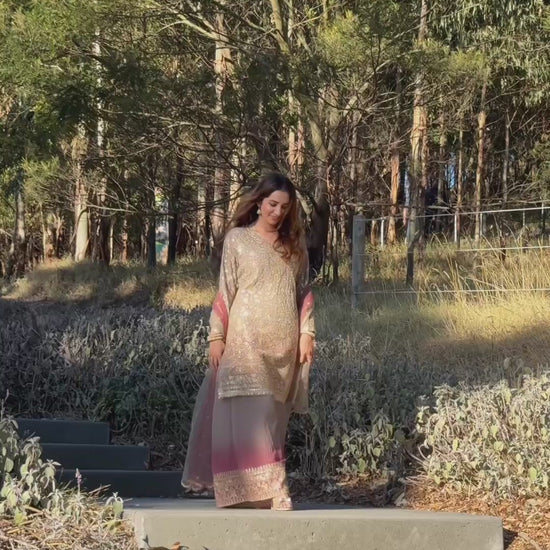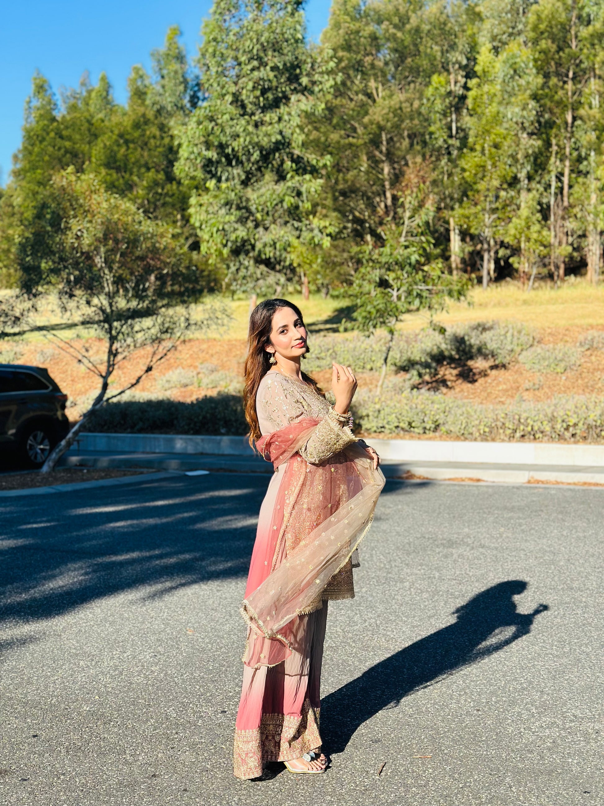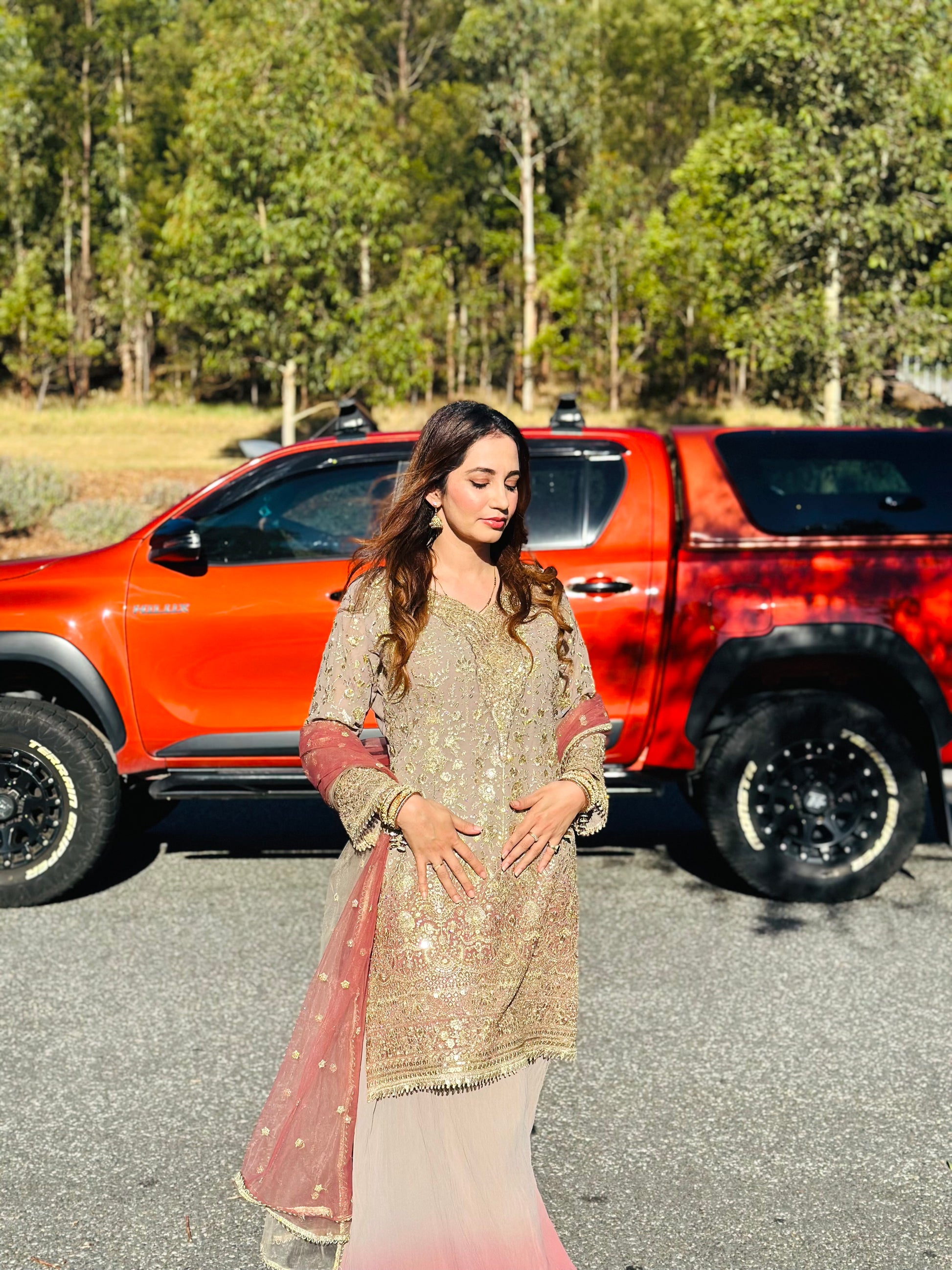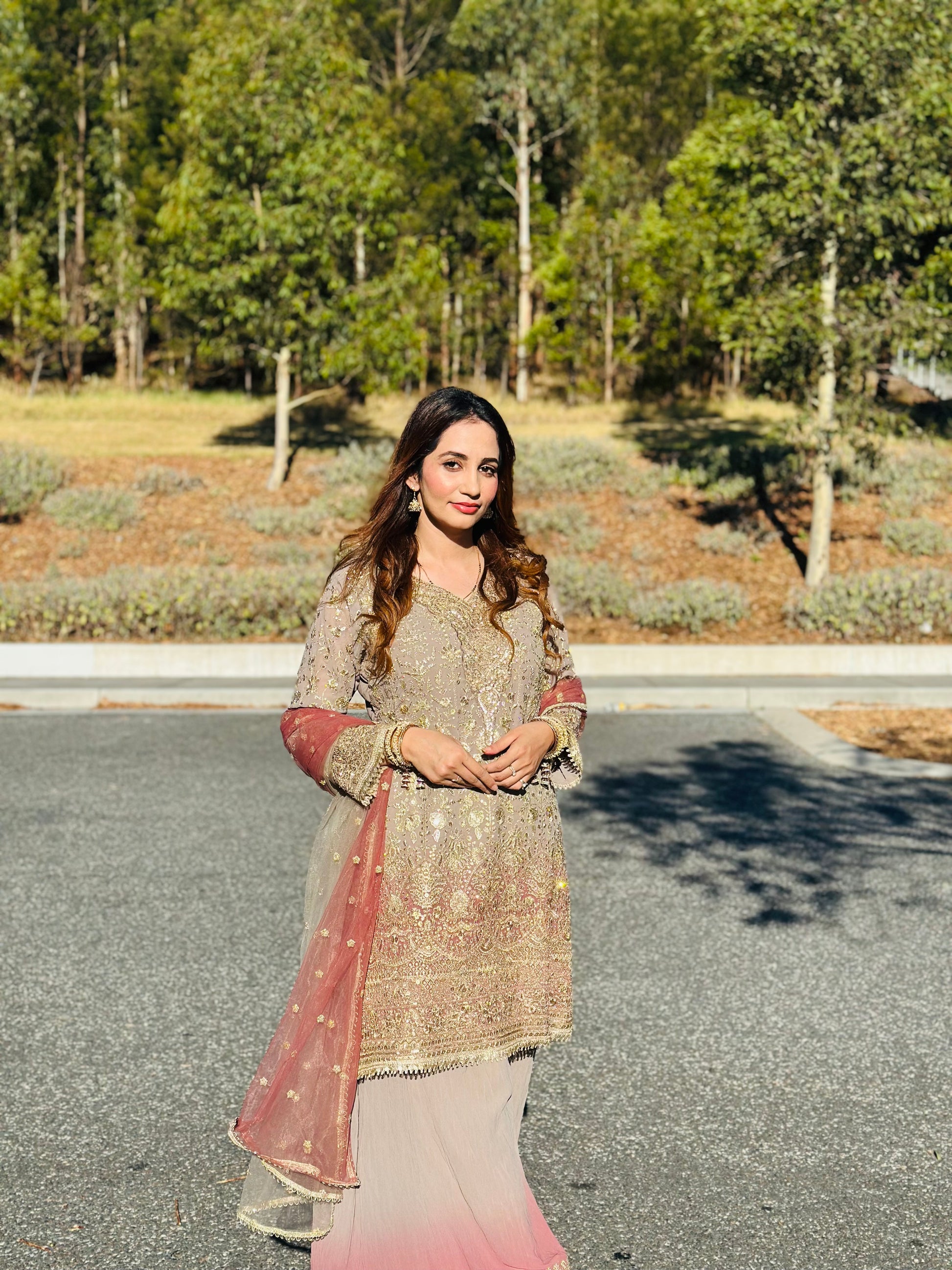 This eye-catching suit set is a true statement of luxury and craftsmanship, featuring heavy Swarovski stone work that sparkles with every movement.